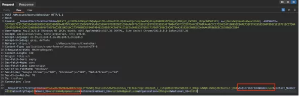 An attacker sends an HTTP POST request to the AdHoc User creation endpoint at https://domain.com/eMsecure/Users/AdhocUser with the “Name” parameter set to a new name (e.g., “Juan”) and the email address of an existing user as shown in figure 2.