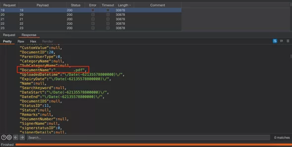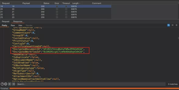 Consultantans identified responses containing the “DocumentName” and “EncryptedDocumentId” parameters, which reveal the document’s name and it is encrypted identifier.