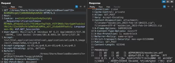 With the information in figure x the consultants manipulated the request https://domain.com//Areas/Share/InternalUserCompletedDownload?ID=<EncryptedDocumentId> for download documents from other profiles, providing the “EncryptedDocumentId” value in the “ID” web parameter, allowing to display documents upload from the any as shown in figure 4.