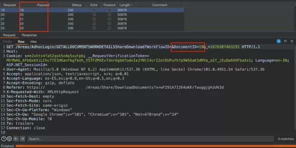 Logged in as a low-privilege user [email protected] and clicking on the option to download documents as shown in figure 6, An attacker intercept the request https://domain.com/Areas/AdhocLogin/GETALLDOCUMENTSWORKDETAILSShareDownload?WorkFlowID=&DocumentID=19 the consultants noticed that the DocumentId parameter loads numbers sequentially to obtain document information. Consultants used the burpsuite intruder tool to automatically send numbers between 1 and 999 as shown in figure 1.